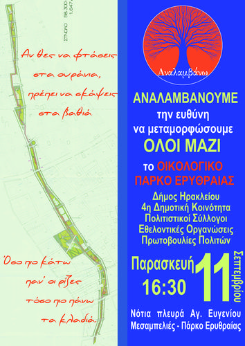 Πιο συγκεκριμένα την Παρασκευή 11 Σεπτεμβρίου στις 16:30 το απόγευμα ο Δήμος Ηρακλείου, η 4η Δημοτική Κοινότητα, Πολιτιστικοί Σύλλογοι, Εθελοντικές Οργανώσεις, Πρωτοβουλίες Πολιτών θα προχωρήσουν στον καθαρισμό της νότιας πλευράς του Αγίου Ευγενίου, στο πάρκο Ερυθραίας.