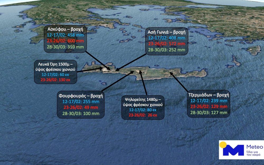Οι τροχιές των 3 βαρομετρικών χαμηλών που οδήγησαν σε πολύ μεγάλα ύψη βροχής και χιονιού στην Κρήτη μεταξύ 12/02 και 30/03/2019. Με μπλε βέλη παρουσιάζεται η πορεία του χαμηλού κατά τη διάρκεια της Χιόνης (12-17/02/2019), με κόκκινα βέλη το χαμηλό της Ωκεανίδας (23-26/02/2019) και το πιο πρόσφατο βαρομετρικό χαμηλό μεταξύ 28 και 30/03/2019 διακρίνεται με πράσινα βέλη.