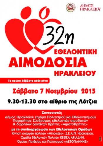 Εθελοντική Αιμοδοσία θα πραγματοποιηθεί το Σάββατο 7.11.2015 στο κέντρο της πόλης του Ηρακλείου, (στο Αίθριο της Λότζια) και ώρες 09:30 – 13:30. Πρόκειται για μια κοινή προσπάθεια αιμοδοσίας εθελοντικών σωματείων και οργανώσεων του Ηρακλείου, την οποία συντονίζουν: