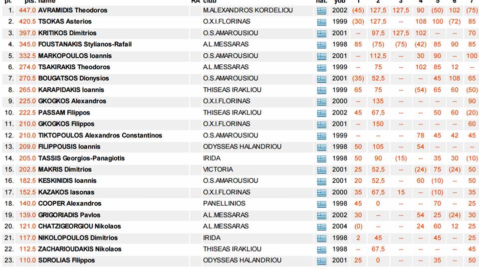 Η ομάδα της Αθλητικής Λέσχης Μεσσαράς Καπετάν Μιχάλης Κόρακας μετά και τους τελευταίους αγώνες της κατηγορίας να έχει 4 αθλητές της στην πρώτη 20αδα της πανελλήνιας κατάταξης και οι οποίοι θα δώσουν το παρών στη μεγάλη αυτή διοργάνωση.