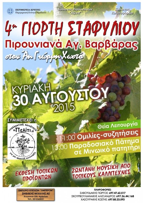 Την Κυριακή 30 Αυγούστου 2015 και για τέταρτη συνεχόμενη χρονιά ο Σύλλογός Πιρουνιανών “Αξέντι” διοργανώνει τη Γιορτή Σταφυλιού.