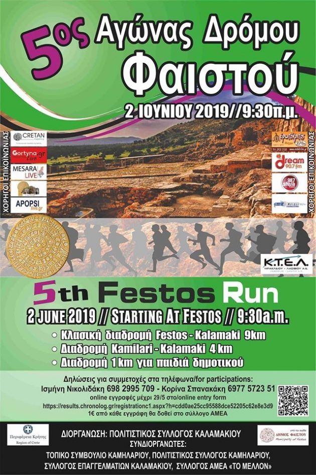 Στις 2 Ιουνίου 2019, σε μια κλασική διαδρομή 9 χλμ., μια διαδρομή από το Καμηλάρι μέχρι το Καλαμάκι 4 χλμ., μια διαδρομή 1 χλμ. Για τα παιδιά, με εκκίνηση τον Αρχαιολογικό χώρο της Φαιστού, θα πραγματοποιηθεί ο 5ος αγώνας δρόμου Φαιστού.