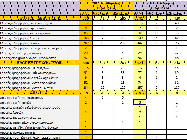 Συγκριτικά με το 2015, υπάρχει αύξηση σχετικά με υποθέσεις απάτης, λαθρεμπορίου, ναρκωτικών και όπλων.