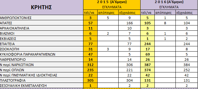 Ειδικότερα, για το Α’ εξάμηνο του 2916, βεβαιώθηκαν πέντε ανθρωποκτονίες, δύο υποθέσεις σεξουαλικής εκμετάλλευσης, έξι βιασμοί και εκατοτριάντα μία υποθέσεις πλαστογραφίας.