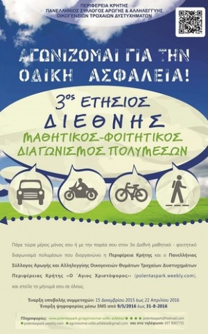 Με την συνδιοργάνωση της Περιφέρειας Κρήτης ο «3ος Διεθνής Μαθητικός Φοιτητικός Διαγωνισμός Πολυμέσων, video clip, ηχητικού μηνύματος, αφίσας, με τίτλο: «Αγωνίζομαι για την οδική ασφάλεια”-Ας συμβάλλουμε όλοι για να χάσουμε την πρωτιά …. στα τροχαία δυστυχήματα»