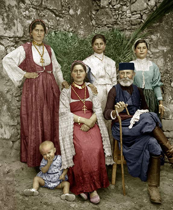 Σε μια θαυμάσια φωτογραφία, μάλλον πλανόδιου φωτογράφου της δεκαετίας του 1930, οι δυο μεγαλύτερες κοπέλες ποζάρουν στολισμένες με τις επίσημες ενδυμασίες της εποχής και, βέβαια, με τους εξαίρετους αμπρακάμους, το πιο γνωστό και το πιο διαδεδομένο κόσμημα της Κρήτης!