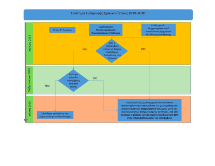 Διευκρινίζεται, ότι οι μαθητές που επέλεξαν τις πανελλαδικές, μετά τις εξετάσεις και τη δημοσιοποίηση των βαθμών τους της τελικής επίδοσης, υποχρεούνται τον Ιούλιο του 2020, μετά τις πανελλαδικές, να συμπληρώσουν εκ νέου το μηχανογραφικό και να θέσουν όσες επιλογές Τμημάτων επιθυμούν, ασχέτως του περιεχομένου του πρώτου μηχανογραφικού και θα εισαχθούν σε αυτά με βάση τις επιδόσεις τους, όπως ακριβώς ισχύει στο υπάρχον σύστημα εισαγωγής, συνυπολογίζοντας και τον βαθμό του απολυτηρίου. Για τους παλαιότερους αποφοίτους δεν προτείνεται να λογίζεται το απολυτήριο, δεδομένου ότι όταν αποφοίτησαν δεν υπήρχε αντίστοιχη πρόβλεψη. Συνεπώς, οι υποψήφιοι αυτοί θα συμμετέχουν κανονικά στις πανελλαδικές εξετάσεις όπως και σήμερα.
