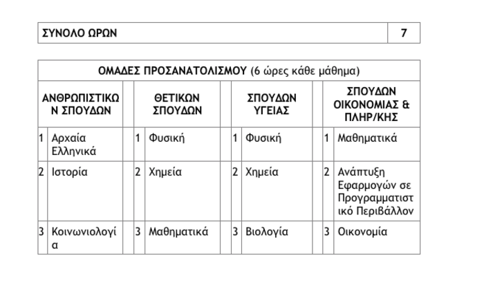 * Τα βασικά μαθήματα της κάθε ομάδας είναι τα ίδια με την αντίστοιχη σημερινή Ομάδα Προσανατολισμού, με εξαίρεση την αντικατάσταση των Λατινικών από το μάθημα της Κοινωνιολογίας.