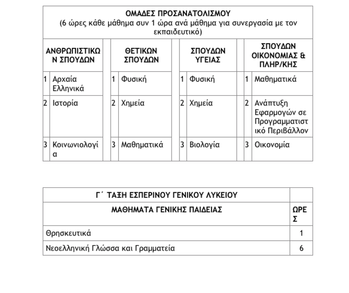 *Για το ημερήσιο Γενικό Λύκειο προβλέπονται τρία μαθήματα Γενικής Παιδείας, Νεοελληνική Γλώσσα και Γραμματεία (6 ώρες), Θρησκευτικά (1 ώρα) και Φυσική Αγωγή (2 ώρες), ενώ για το εσπερινό Γενικό Λύκειο προβλέπονται δύο μαθήματα Γενικής Παιδείας, Νεοελληνική Γλώσσα (6 ώρες) και Θρησκευτικά (1 ώρα).