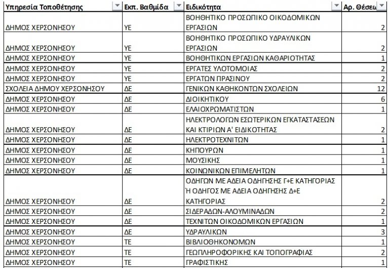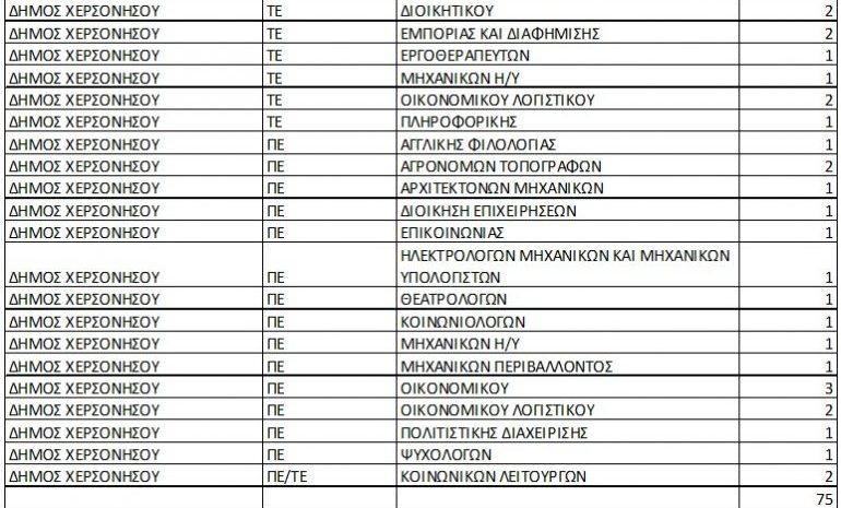 Στο Δήμο Χερσονήσου, θα απασχοληθούν συνολικά 75 άτομα διαφόρων ειδικοτήτων σύμφωνα με τον επισυναπτόμενο πίνακα.