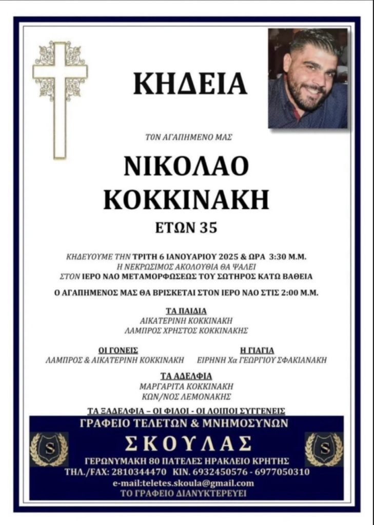 Σε κλίμα βαθιάς οδύνης και σιωπηλού πένθους, συγγενείς, φίλοι και σύσσωμη η τοπική κοινωνία θα αποχαιρετήσουν την Τρίτη και ώρα 3:30 το απόγευμα, τον Νίκο Κοκκινάκη, πατέρα δύο μικρών παιδιών, που έφυγε τόσο άδικα από τη ζωή, παραμονή των Θεοφανίων.