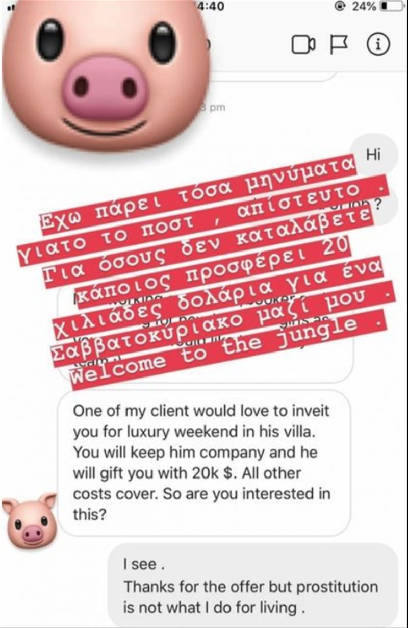 Το ξεκίνημα το είχε κάνει η Ιωάννα Τούνη, η οποία είχε δημοσιεύσει ένα μήνυμα με ανήθικη πρόταση στο Instagram