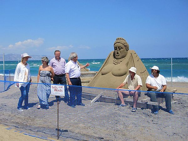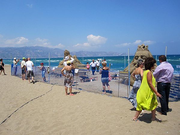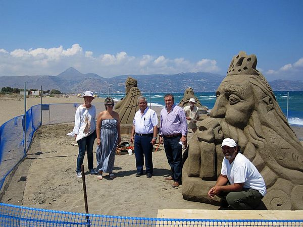 Μαγεύουν τα γλυπτά στην άμμο που φιλοτεχνούν οι καταξιωμένοι γλύπτες Μανώλης Χαρκούτσης, Yuriy Mysko και Lyudmyla Mysko, στην Αμμουδάρα, στο πρώτο στην Ελλάδα Φεστιβάλ Γλυπτικής στην άμμο