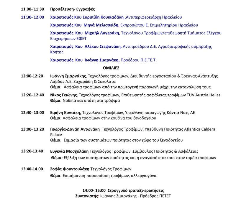 Ξεκινάμε στο Ηράκλειο, με θέμα «Ασφάλεια και ποιότητα τροφίμων στην κουζίνα του ξενοδοχείου & την μαζική εστίαση» με την φιλοξενία του Επαγγελματικού Επιμελητηρίου Ηρακλείου. Αίθουσα Καστελάκη Σάββατο 21/4/2018 , 11.00-18.00.