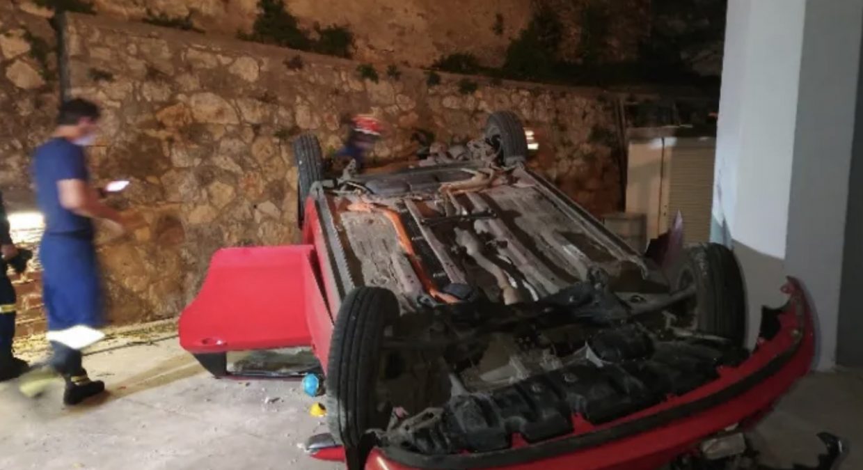 Αυτοκίνητο, υπό άγνωστες συνθήκες, εξετράπη της πορείας του και έπεσε από τον πάνω δρόμο στο πίσω μέρος της πυλωτής πολυκατοικίας.