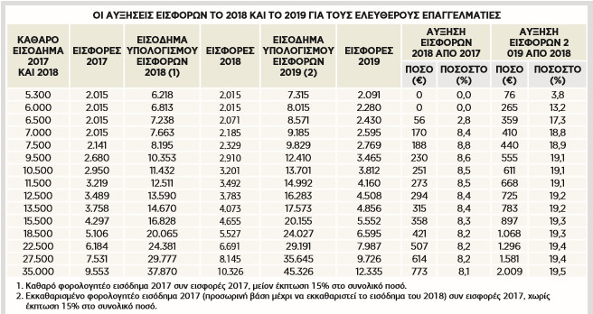 – Αν το εισόδηµά του δεν ήταν 6.000 ευρώ αλλά 6.500 ευρώ, τότε, όπως φαίνεται στον αποκαλυπτικό πίνακα που επεξεργάστηκε και δηµοσιεύει ο «Ε.Τ.», θα πλήρωνε την ελάχιστη εισφορά (2.015 ευρώ) µόνο για το 2017. Το 2018 που οι εισφορές δεν αφαιρούνται από το εισόδηµα αλλά το άθροισµά τους (εισόδηµα και εισφορές) έχει έκπτωση 15%, ο επαγγελµατίας θα βρεθεί πάνω από το όριο εισοδήµατος των 7.033 ευρώ, στα 7.238 ευρώ, και πληρώνει 2.071 ευρώ. Ενώ το 2019 που δεν υπάρχει η έκπτωση 15%, το εισόδηµα υπολογισµού εισφορών είναι 8.571 ευρώ και η νέα εισφορά για την επόµενη χρονιά ανεβαίνει στα 2.430 ευρώ, µε αύξηση επιβάρυνσης κατά 359 ευρώ ετησίως ή κατά 17,3%