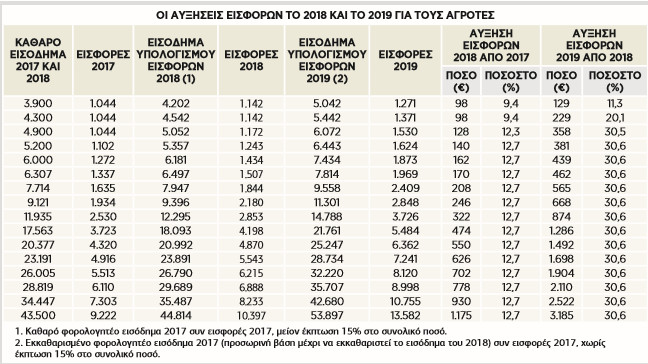 Αγρότης µε εισόδηµα 4.900 ευρώ πλήρωνε την κατώτατη εισφορά το 2017, µε 1.044 ευρώ ετησίως (87 ευρώ το µήνα). Φέτος, λόγω της αλλαγής στον υπολογισµό, πληρώνει εισφορά επί «εισοδήµατος» 5.052 ευρώ και ας έχει δηλώσει 4.900 ευρώ. Η επιβάρυνση για το 2018 είναι 1.172 ευρώ µε αύξηση 12,3% από το 2017. Το 2019 όµως θα πληρώσει εισφορές επί «εισοδήµατος» 6.072 ευρώ διότι στις 4.900 ευρώ που δηλώνει θα προστεθούν και οι εισφορές των 1.172 ευρώ, χωρίς καµία έκπτωση, οπότε οι νέες εισφορές του 2019 θα υπολογιστούν µε αυξηµένο ποσοστό 25,2% επί αυξηµένου «εισοδήµατος»! Η επιβάρυνση θα είναι 1.530 ευρώ, µε αύξηση 30,5% από το 2018.