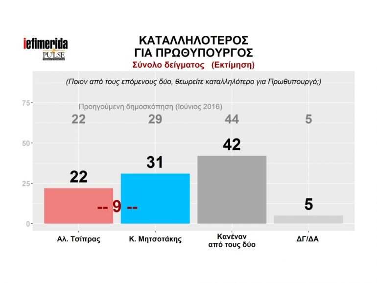 Στις οκτώ μονάδες είναι η διαφορά της Νέας Δημοκρατίας από τον ΣΥΡΙΖΑ, σύμφωνα με τα αποτελέσματα της δημοσκόπησης της εταιρείας Pulse για λογαριασμό του iefimerida