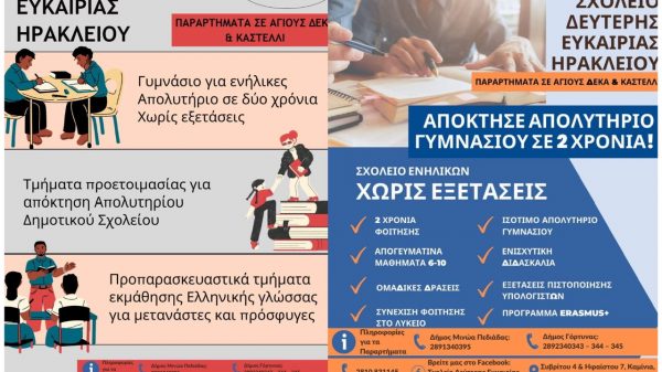 Συνεχίζονται, έως και τις 30 Σεπτεμβρίου 2025 οι εγγραφές στο Σχολείο Δεύτερης Ευκαιρίας (ΣΔΕ), στους Αγίους Δέκα, που απευθύνεται σε ενήλικες οι οποίοι επιθυμούν...