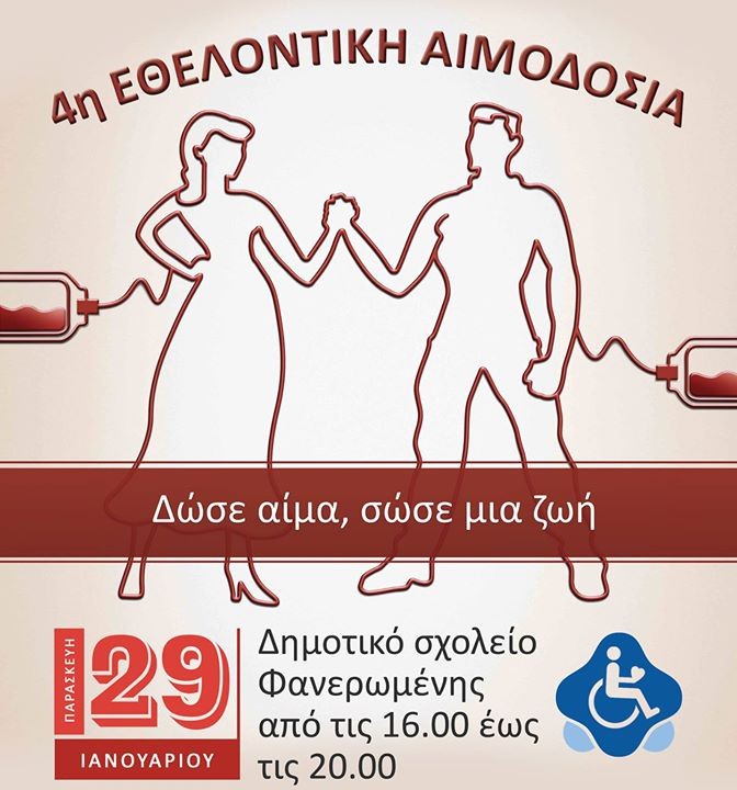 4η Εθελοντική αιμοδοσία Σύλλογο ΑμεΑ Νότιας Κρήτης «ΤΟ ΜΕΛΛΟΝ» Η αιμοδοσία θα πραγματοποιηθεί την Παρασκευή 29 Ιανουαρίου, στο κτίριο του Συλλόγου στη Φανερωμένη, από τις...
