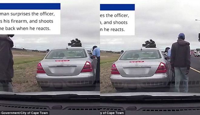 Σκηνή Far West στους δρόμους της Νότιας Αφρικής, όπου άνδρας πυροβόλησε πισώπλατα αστυνομικό, την ώρα που έκοβε κλήση Η κάμερα ενός περιπολικού στο Κέιπ...