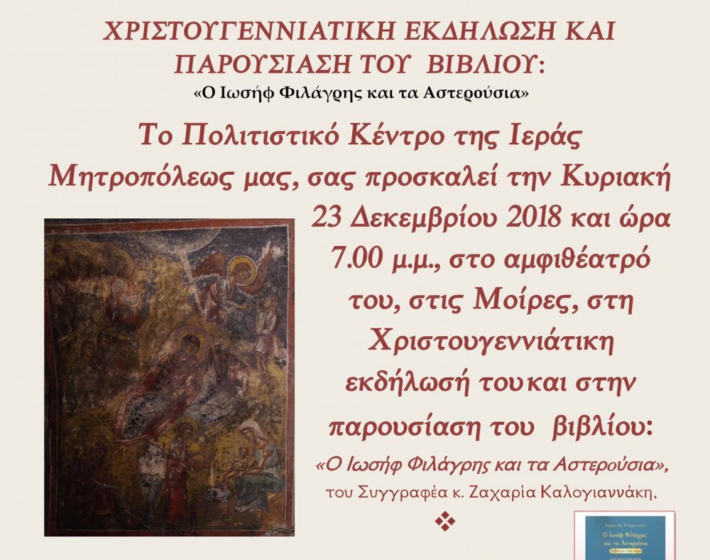 Χριστουγεννιάτικη εκδήλωση – παρουσίαση του βιβλίου: «Ο Ιωσήφ Φιλάγρης και τα Αστερoύσια» στο Πολιτιστικό Κέντρο της Ι. Μητροπόλεως Γορτύνης και Αρκαδίας Το Πολιτιστικό Κέντρο...