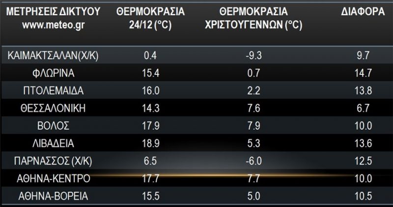 H θερμοκρασία θα κυμανθεί, στη Δυτική Μακεδονία από -10 έως 3 βαθμούς, στη Βόρεια Ελλάδα από -6 έως 7, στην Κεντρική Ελλάδα από -5 έως 7 βαθμούς, στην Ήπειρο από -2 έως 9, στη Δυτική και Νότια Ελλάδα από 2 έως 11 βαθμούς, στα υπόλοιπα ηπειρωτικά από -2 έως 6, στα νησιά του Ιονίου από 2 έως 10 βαθμούς, στα νησιά του Βόρειου Αιγαίου και στις Σποράδες από 1 έως 6 και στα υπόλοιπα νησιωτικά τμήματα του Αιγαίου και στην Κρήτη από 5 έως 15 βαθμούς Κελσίου.