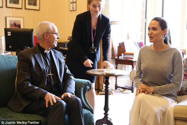 H διάσημη ηθοποιός του Χόλιγουντ και ειδική απεσταλμένη του ΟΗΕ συναντήθηκε την Πέμπτη με τον Αρχιεπίσκοπο του Καντέρμπερι στο παλάτι Λάμπεθ του Λονδίνου και τα στιγμιότυπα που εξασφάλισε ο φωτογραφικός φακός αποκαλύπτουν την γκάφα της Τζολί.