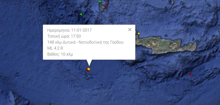 Η δεύτερη σεισμική δόνηση μεγέθους 4,2 βαθμών της Κλίμακας Ρίχτερ σημειώθηκε στις 17.50 το απόγευμα της Τερτάρτης στη θαλάσσια περιοχή νότια της Κρήτης.