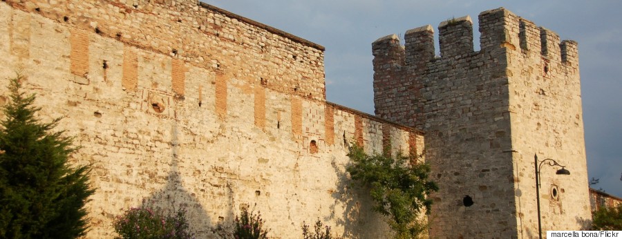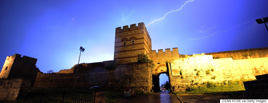 Όσον αφορά στα θρυλικά τείχη της Πόλης, τα χερσαία – Θεοδοσιανά- τείχη είχαν μήκος 5.570 μέτρων περίπου, και εκτείνονταν από την αποβάθρα των Πηγών στην Ακτής Προποντίδας ως τη συνοικία των Βλαχερνών. Σε όλο το μήκος τους ήταν διπλά, και η κύρια γραμμή άμυνας ήταν το έσω τείχος, ύψους 12 μέτρων και πλάτους πέντε, με 96 πύργους, ύψους 18-20 μέτρων. Το έξω τείχος είχε 8,5 μέτρα ύψος και 2 πλάτος, με 96 πύργους. Τα χερσαία τείχη είχαν 10 πύλες, ενώ η τάφρος, κατά μήκος του έξω τείχους είχε πλάτος 19-21 μέτρα και το βάθος της ήταν περίπου 10 μέτρα. Η ακτογραμμή της πόλης προστατευόταν από τα θαλάσσια τείχη.