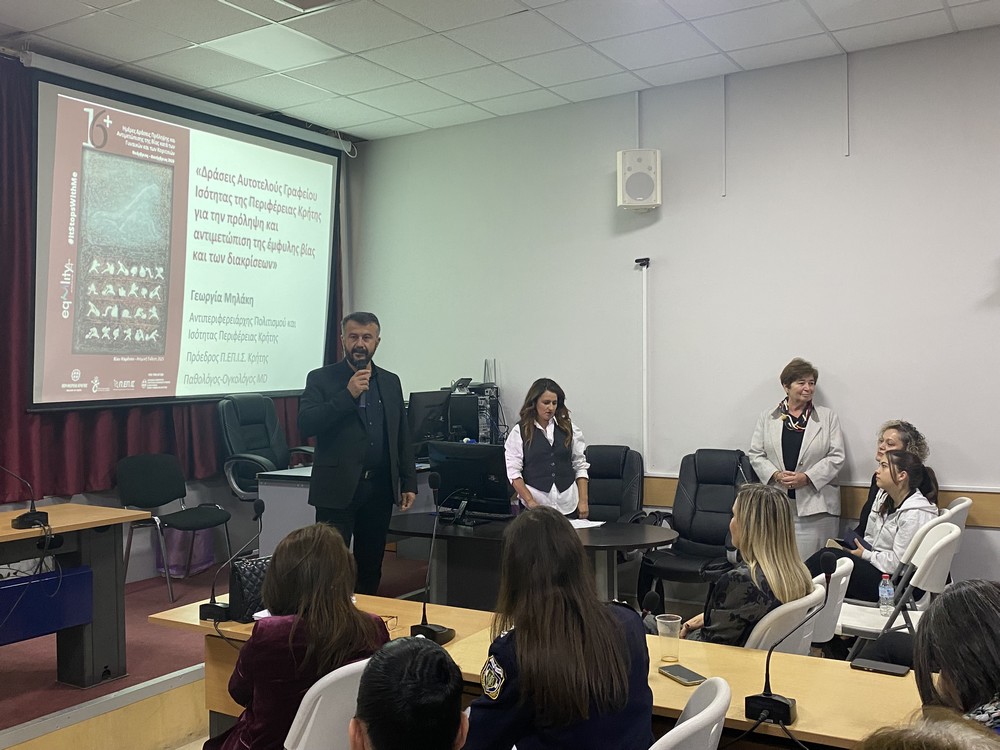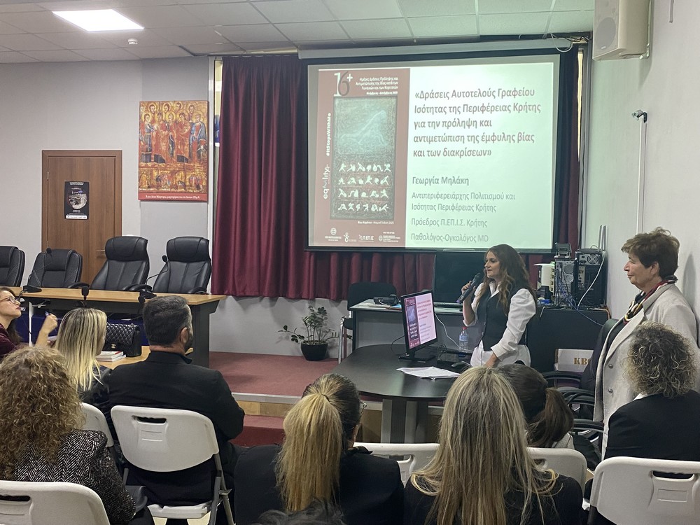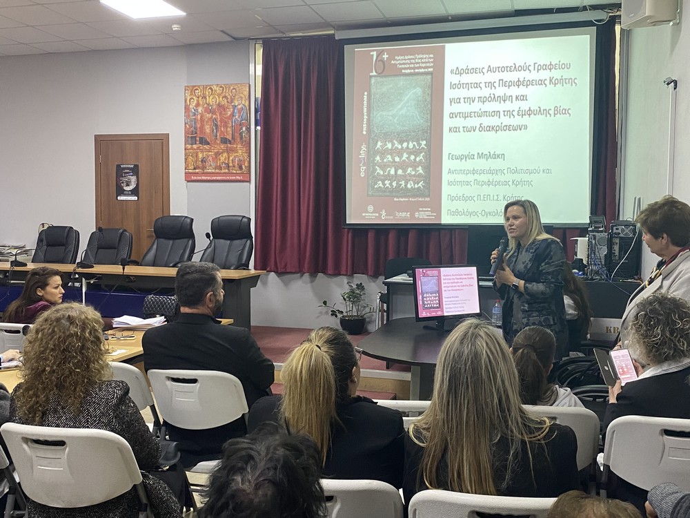 Η Αντιπεριφερειάρχης Πολιτισμού και Ισότητας της Περιφέρειας Κρήτης, Γεωργία Μηλάκη, εστίασε στον ρόλο της τοπικής αυτοδιοίκησης και στις πρωτοβουλίες της Περιφέρειας Κρήτης – Αυτοτελούς Γραφείου Ισότητας, με στόχο την ενημέρωση και ευαισθητοποίηση των πολιτών. «Η ισότητα είναι κουλτούρα και ο πολιτισμός το ισχυρότερο εργαλείο πρόληψης. Η βία σταματάει από εμάς. Όλοι είμαστε υπεύθυνοι, ώστε να σταματήσει αυτή η αλυσίδα» ανέφερε, μεταξύ άλλων.