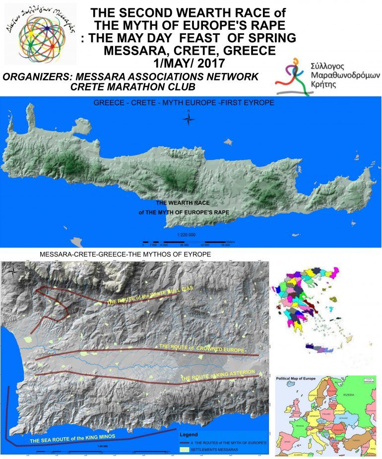 Την ήμερα της Πρωτομαγιάς το Δίκτυο Συλλόγων Μεσσαράς με συνεργασία με το Σύλλογο Μαραθωνοδρόμων Κρήτης, οι ημεροδρόμοι (μαραθωνοδρόμοι ως δίκτυο αθλητών) θα τρέξουν μεταφέροντας στεφάνι με το όνομα της Ευρώπης στο κέντρο του, διασχίζοντας τη Μεσσαρά σε τέσσερεις συμβολικές διαδρομές. Παράλληλα μπορούν να συμμετέχουν περιπατητές, προσκυνητές της φύσης , περπατώντας από χωριό τους στο διπλανό χωριό ακλουθώντας το Μυθικό στεφάνη από τις διαφορετικές διαδρομές κλπ