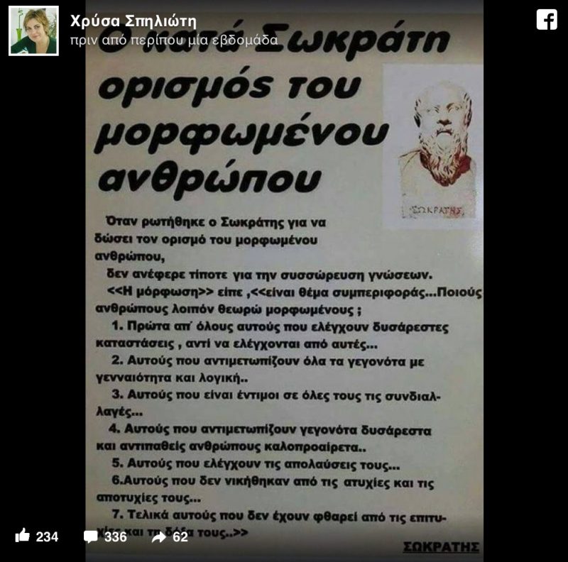 Στο post της αυτό κάνει λόγο για τη μόρφωση ως «θέμα συμπεριφοράς», επικαλούμενη τον Σωκράτη.