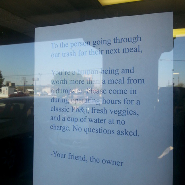 Είσαι ανθρώπινο ον και αξίζεις πολλά περισσότερα από το να τρέφεσαι από κάδο σκουπιδιών. Σε παρακαλώ, έλα μέσα τις ώρες που λειτουργούμε για ένα κλασσικό σάντουιτς με φυστικοβούτυρο, φρέσκα λαχανικά και ένα ποτήρι νερό χωρίς χρέωση. Δεν χρειάζεται να ρωτήσεις κάτι.