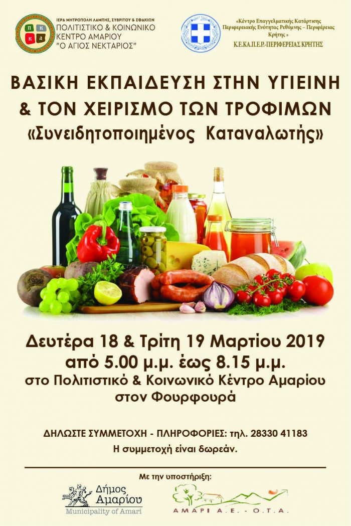 Το Πολιτιστικό & Κοινωνικό Κέντρο Αμαρίου “Ο Άγιος Νεκτάριος”, της Ι. Μητρόπολης Λάμπης, Συβρίτου και Σφακίων, σε συνεργασία με το Κέντρο Επαγγελματικής Κατάρτισης της Περιφερειακής Ενότητας Ρεθύμνου (ΚΕΚΑΠΕΡ – Περιφέρειας Κρήτης), συνδιοργανώνουν διήμερη εκπαίδευση με θέμα: