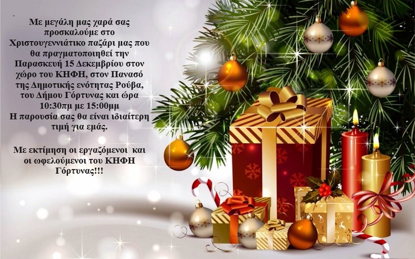 Οι ωφελούμενοι του ΚΗΦΗ, στον Πανασό, με την υποστήριξη των εργαζομένων της δομής, διοργανώνουν την Παρασκευή 15/12/2023 χριστουγεννιάτικο παζάρι, με τις δικές τους πρωτότυπες δημιουργίες.