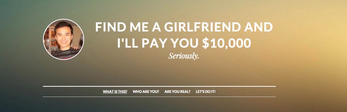 Ο Ren Lu You από την Αλαμπάμα έχει επιχειρήσει 30 ανεπιτυχή ραντεβού τους τελευταίους δέκα μήνες. Έτσι, για να διορθώσει αυτή την κατάσταση, δημιούργησε μια ιστοσελίδα που προσφέρει 10.000 δολάρια αμοιβή, σε όποιον μπορέσει να του βρει… κοπέλα!
