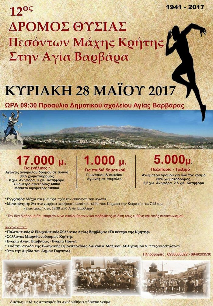Την Κυριακή 28 Μαΐου 2017 με αφορμή τη μάχη της Κρήτης θα πραγματοποιηθεί ο επετειακός 12ος αγώνας δρόμου, αφιερωμένος στους ανθρώπους που έχασαν τη ζωή τους για την ελευθερία στο νησί της Κρήτης.