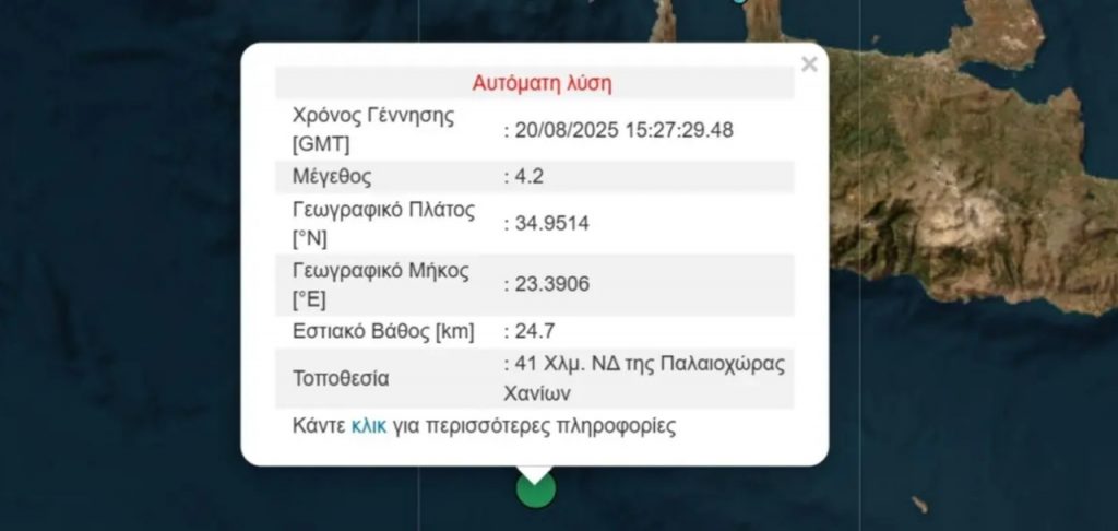 Σεισμική δόνηση μεγέθους 4,2 βαθμών της κλίμακας Ρίχτερ σημειώθηκε το απόγευμα της Τετάρτης, στη θαλάσσια περιοχή νότια των Χανίων.