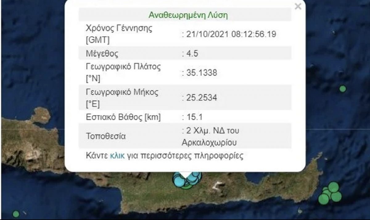 Τόσο στις 11:12, όσο και στις 12:37 σημειώθηκαν σεισμικές δονήσεις μεγέθους 4,5 βαθμών της κλίμακας Ρίχτερ, 2 χλμ νοτιοδυτικά του Αρκαλοχωρίου με εστιακό βάθος 15,1 χλμ, σύμφωνα με το Γεωδυναμικό Ινστιτούτο.