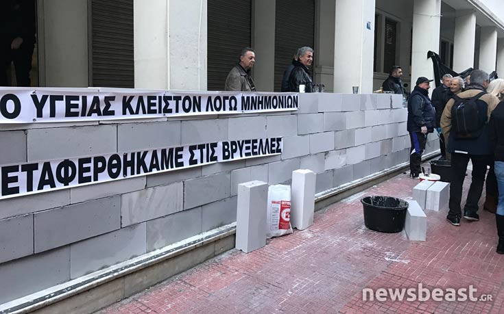 Σε μία συμβολική κίνηση διαμαρτυρίας προχώρησαν νωρίς το πρωί οι εργαζόμενοι στα δημόσια νοσοκομεία, χτίζοντας την είσοδο του υπουργείου Υγείας, στην οδό Αριστοτέλους
