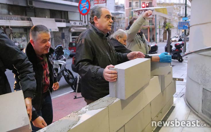 Την είσοδο του υπουργείου Υγείας, στην οδό Αριστοτέλους, χτίζουν οι εργαζόμενοι στα δημόσια νοσοκομεία, που βρίσκονται σήμερα σε κινητοποιήσεις.