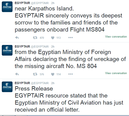 Έπειτα από ώρες ερευνών για τον εντοπισμό του αεροσκάφους της EgyptAir που εξαφανίστηκε και συνετρίβη στη Μεσόγειο ενώ κατευθυνόταν στο Κάιρο, η αιγυπτιακή αεροπορική εταιρεία ανακοίνωσε το απόγευμα της Πέμπτης πως βρέθηκαν τα συντρίμμια του αεροσκάφους.