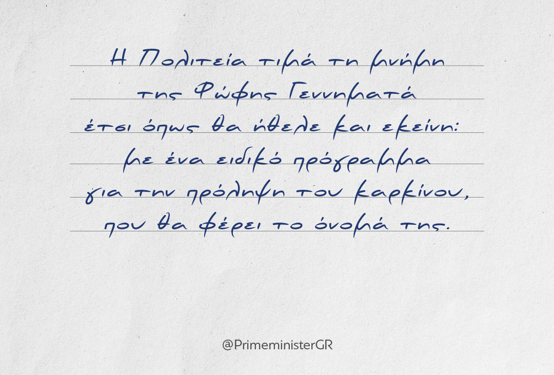 «Η Πολιτεία τιμά τη μνήμη της Φώφης Γεννηματά έτσι όπως θα ήθελε και εκείνη: με ένα ειδικό πρόγραμμα για την πρόληψη του καρκίνου, που θα φέρει το όνομά της» αναφέρει σε ανάρτηση του στο Facebook ο πρωθυπουργός Κυριάκος Μητσοτάκης ανακοινώνοντας την έναρξη προγράμματος για την πρόληψη του καρκίνου.