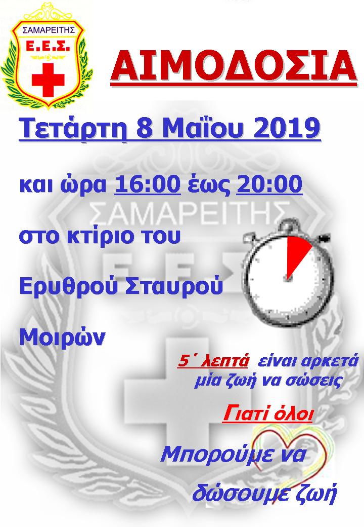 1) Την Τετάρτη 8 Μαίου και ώρες 16:00 έως 20:00, σε συνεργασία με την κινητή μονάδα αιμοληψίας του Πα.Γ.Ν.Η. προσκαλούνται όλοι οι παλιοί αλλά και νέοι αιμοδότες σε αιμοδοσία στην έδρα του ΕΕΣ Μοιρών, στο παλιό οικοτροφείο αρρένων της Ι.Μ. Καλυβιανής.
