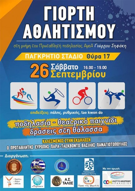 Το Σάββατο 26 Σεπτεμβρίου 2015 ώρα 16:00-19:00 στη θύρα 17 του Παγκρήτιου Σταδίου διοργανώνεται Γιορτή Αθλητισμού στη μνήμη του Πρωταθλητή Ποδηλασίας Α.με.Α. Γιώργου Σηφάκη, που έχασε τη ζωή του ενώ έκανε προπόνηση στο δρόμο των Μοιρών.