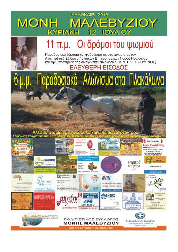 Με τη συνδιοργάνωση της Περιφερειακής Ενότητας Ηρακλείου θα πραγματοποιηθούν οι καλοκαιρινές εκδηλώσεις του Πολιτιστικού Συλλόγου Μονής Μαλεβυζίου.