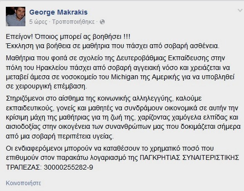 “Επείγον! Όποιος μπορεί ας βοηθήσει! Έκκληση για βοήθεια σε μαθήτρια που πάσχει από σοβαρή ασθένεια. Μαθήτρια που φοιτά σε σχολείο της Δευτεροβάθμιας Εκπαίδευσης στην πόλη του Ηρακλείου πάσχει από σοβαρή αγγειακή νόσο και χρειάζεται να μεταβεί άμεσα σε νοσοκομείο του Michigan της Αμερικής για να υποβληθεί σε χειρουργική επέμβαση.