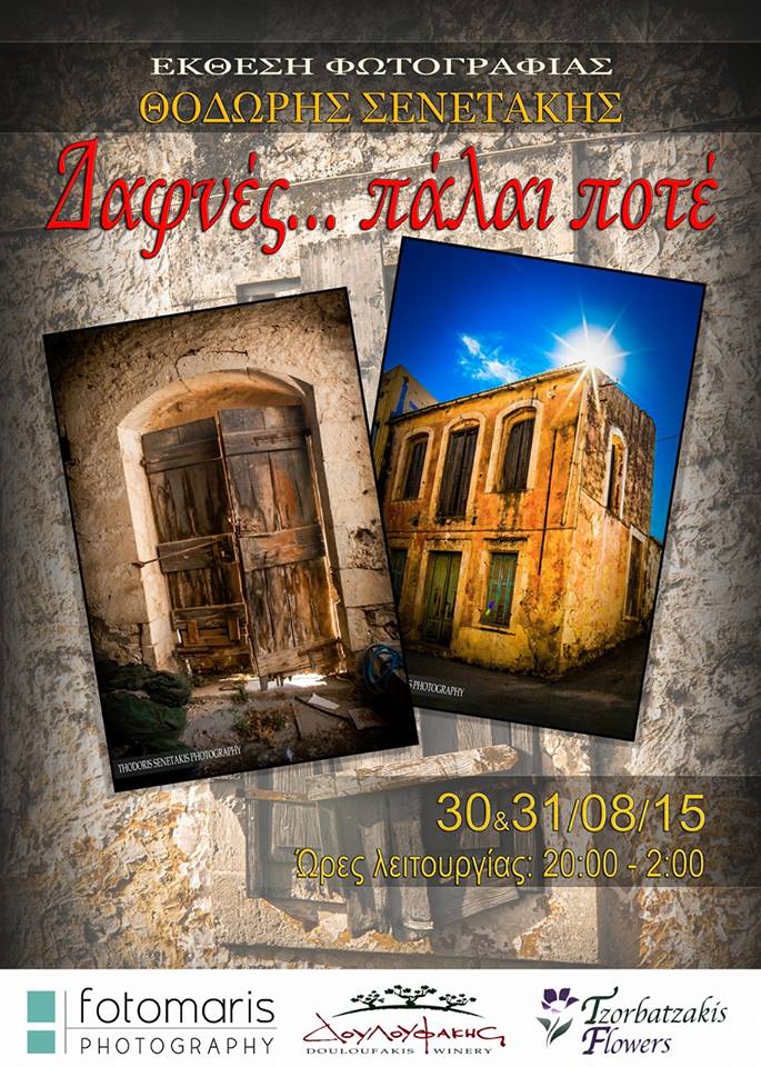Οι Δαφνές, οι «ξεχασμένες» και εγκαταλελειμμένες Δαφνές ζωντανεύουν από τον φωτογραφικό φακό του Θοδωρή Σενετάκη στην έκθεση «Δαφνές… Πάλαι Ποτέ» που πραγματοποιείται την Κυριακή 30 και την Δευτέρα 31 Αυγούστου στην πλατεία του χωριού.