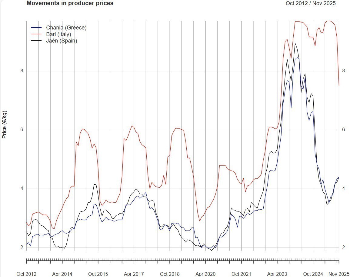 Συγκεκριμένα σύμφωνα με την έκθεση του IOC, την πρώτη εβδομάδα του Νοεμβρίου, η τιμή παραγωγού του εξαιρετικά παρθένου ελαιολάδου μειώθηκε στα Χανιά στα 4,40 ευρώ/κιλό, πτώση δηλαδή 29% σε σχέση με την αντίστοιχη περσινή εβδομάδα. Αντίστοιχα, στις άλλες δύο μεγάλες αγορές της περιοχής, την ισπανική και την ιταλική, στο Χαέν οι τιμές παραγωγού βούτηξαν 36% σε σχέση με την αντίστοιχη περσινή εβδομάδα (4,39 ευρώ/κιλό, ενώ στο Μπάρι οι απώλειες ήταν πιο συγκρατημένες (-16%) στα 7,5 ευρώ/κιλό.